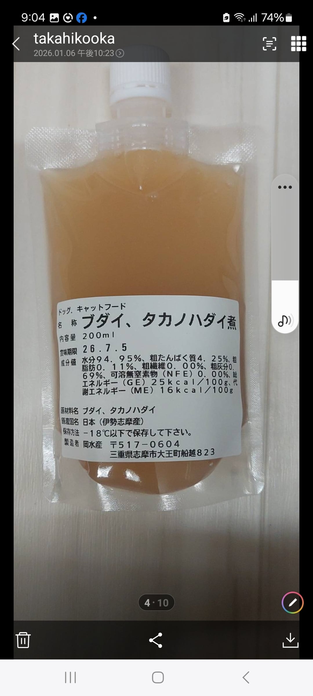 水分94.95%、粗たんぱく質4.25%、粗脂肪0.11%、粗繊維0.00%、粗灰分0.69%、可溶無窒素物(NFE)0.00%、総エネルギー(GE)25kcal/100g、代謝エネルギー(ME)16kcal/100g